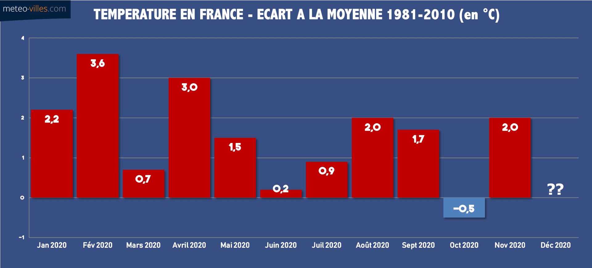 Sur les 11 mois écoulés de cette année 2020, seul le mois d'octobre a terminé sous les moyennes de saison (-0.5°C). Tous les autres mois ont été plus doux / plus chauds que la moyenne climatique 1981-2010, avec un pic en février 2020 (+3.6°C d'anomalie). Pour rappel, le mois d'octobre avait interrompu une série inédite de 16 mois consécutifs au dessus des normes (de juin 2019 à septembre 2020), là aussi du jamais vu dans l'histoire climatologique Française.