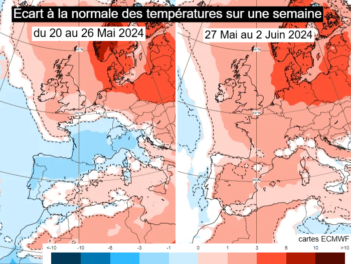 Écart à la normale des températures du 20 au 26 mai et du 27 mai au 2 juin 2024 - via ECMWF