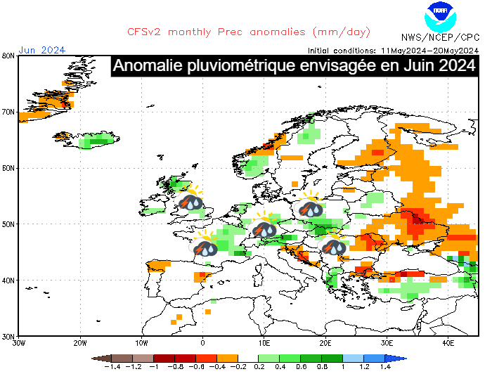 Anomalie pluviométrique modélisée en Europe pour le mois de juin 2024 - via NOAA