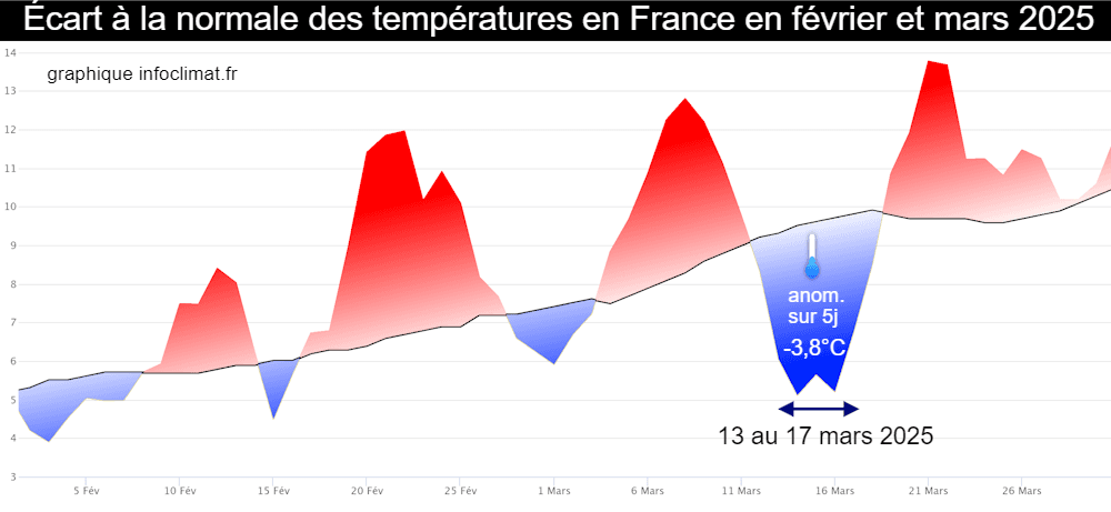 C'est bien au printemps météorologique qu'était survenue la dernière séquence véritablement hivernale sur la France. À la mi-mars, une descente d'air polaire plonge jusqu'à nos régions et fait s'enfoncer les températures sous les normales. Une goutte froide vient ensuite s'isoler au dessus du centre de la France et se maintient plusieurs jours. Entre le 13 et le 17 mars 2025, l'anomalie thermique (aux normales 1991-2020) à échelle nationale atteint -3,8°C.