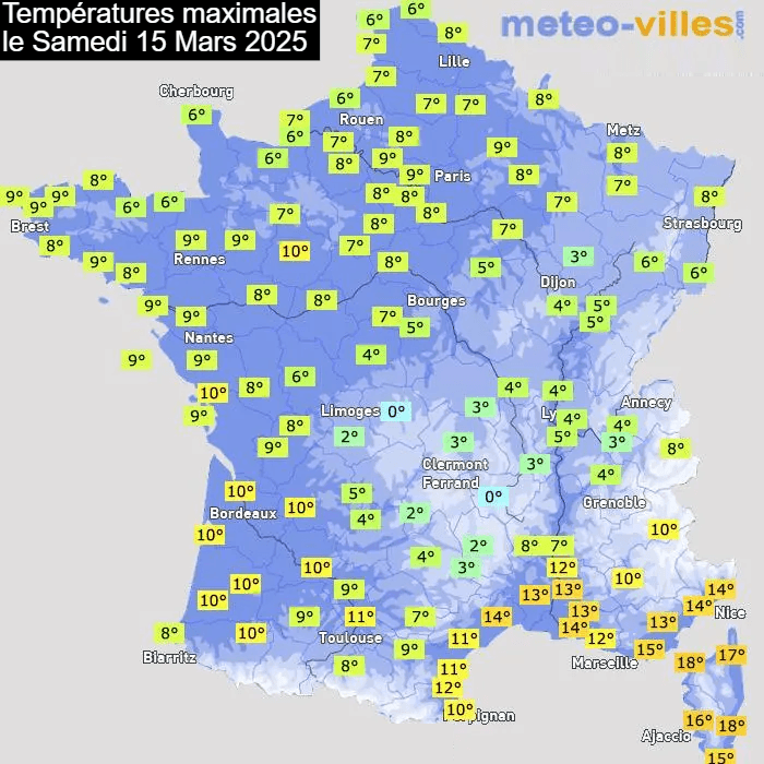 Températures maximales mesurées le samedi 15 mars 2025 - Météo Villes