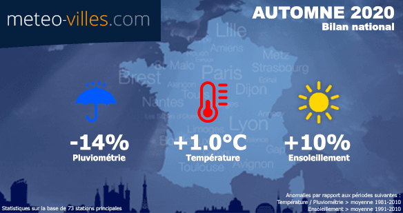 L’hiver calendaire n’est pas encore arrivé (21 décembre), mais d’un point de vue météorologique, ce dernier a débuté depuis le 1er décembre. L’occasion d’effectuer le bilan climatologique de l’ AUTOMNE 2020 (mois de septembre, octobre et novembre) en termes de température, pluviométrie et ensoleillement, sur notre panel de 73 stations métropolitaines*.