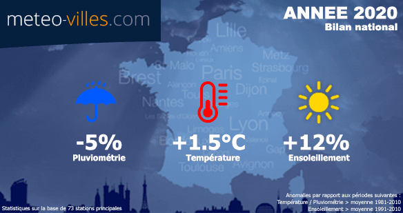 La moyenne annuelle en France (1981-2010) est légèrement supérieure à 12.5°C. L'anomalie thermique de cette année 2020 était donc de l'ordre de +1.5°C, mais ceci cache des disparités. En effet, cette anomalie était encore plus importante en se dirigeant vers les régions du Nord et de l'Est, où celle-ci a approché voire dépassé les +2°C (maximum sur notre panel de +2.2°C à Langres, +2.1°C à Lyon, +2.0°C à Saint-Quentin, Mâcon, Troyes, Bourges et Nevers). Pour Paris-Montsouris, cette année 2020 s'est terminé sur une anomalie de +1.9°C.