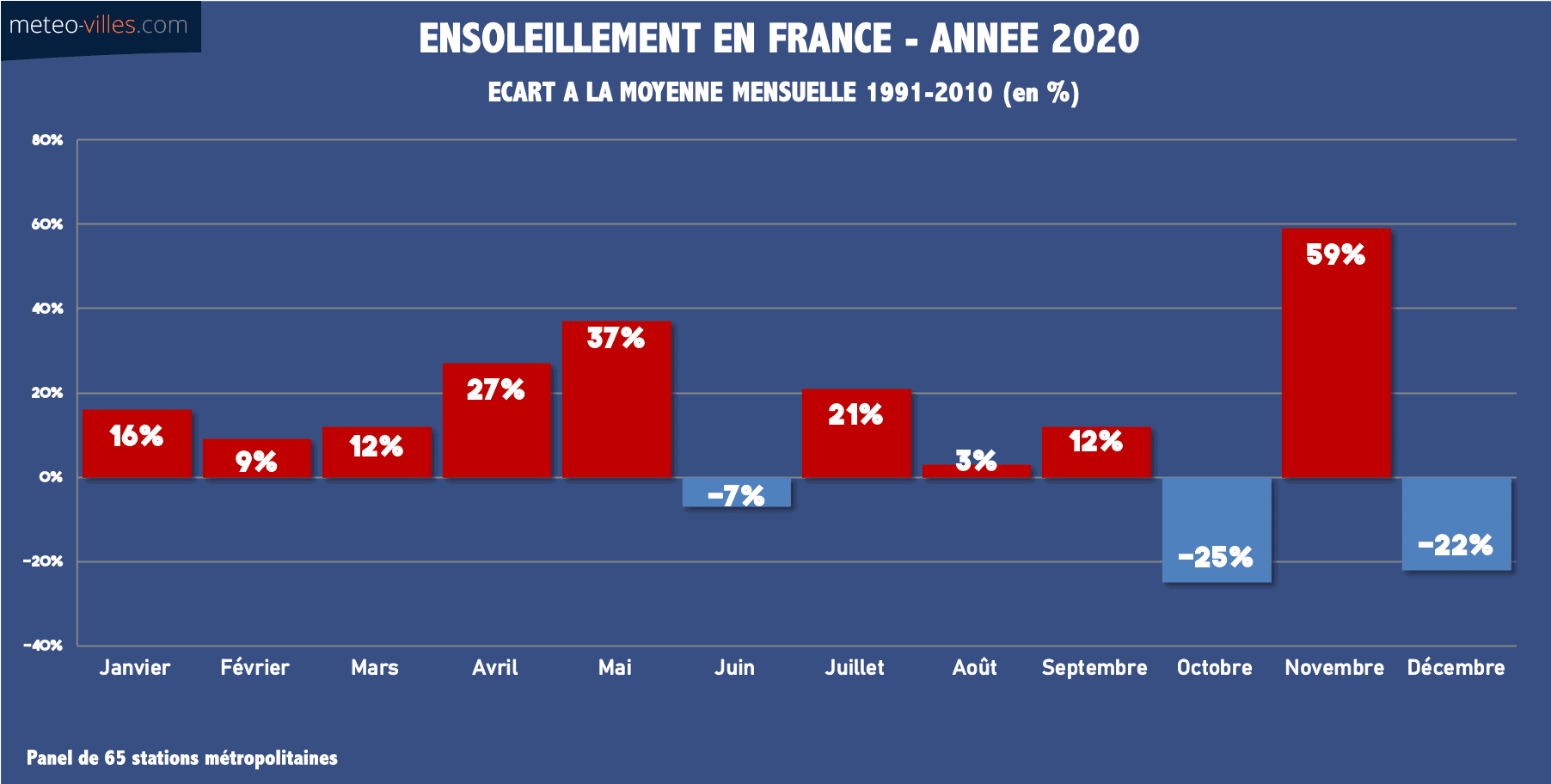 La première moitié de l'année a été particulièrement lumineuse. Ceci était d'autant plus remarquable au cours du printemps où des records ont été battu. La station la plus ensoleillée du printemps 2020 était d'ailleurs une ville de la moitié Nord (Le Touquet - 810h), dépassant les niveaux des régions Méditerranéennes, du jamais vu lors de cette saison. Mais malgré cela, le mois l'excédent le plus notable s'est produit en novembre, avec des conditions anticycloniques durables (+59%).