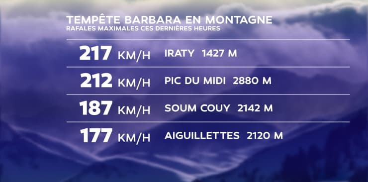 Deux valeurs supérieures à 200 km/h ont été enregistrées avec une rafale maximale de 212 km/h au Pic du Midi (65) à 2880 mètres d'altitude et jusqu'à 217 km/h à Iraty (64) à 1427 mètres d'altitude, une valeur remarquable ! Notons toutefois que cette station hyper-ventilée de la crête frontalière possède des caractéristiques géographiques bien spécifiques et qu'elle n'est pas représentative de la moyenne montagne.
