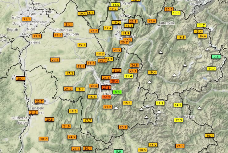 Un important effet de foehn s'est mis en place sur la vallée de Grenoble. Les températures nocturnes ne sont pas descendues sous 20,2°C à Saint-Martin-d'Hères et 21,4°C à Grenoble-CEA - donnant une nuit tropicale ! En après-midi, c'est une véritable chaleur qui a envahi la vallée avec 27,4°C à Grenoble-CEA, 27,8°C à Saint-Martin-d'Hères, 27,9°C à Vizille et 28,0°C au Versoud !