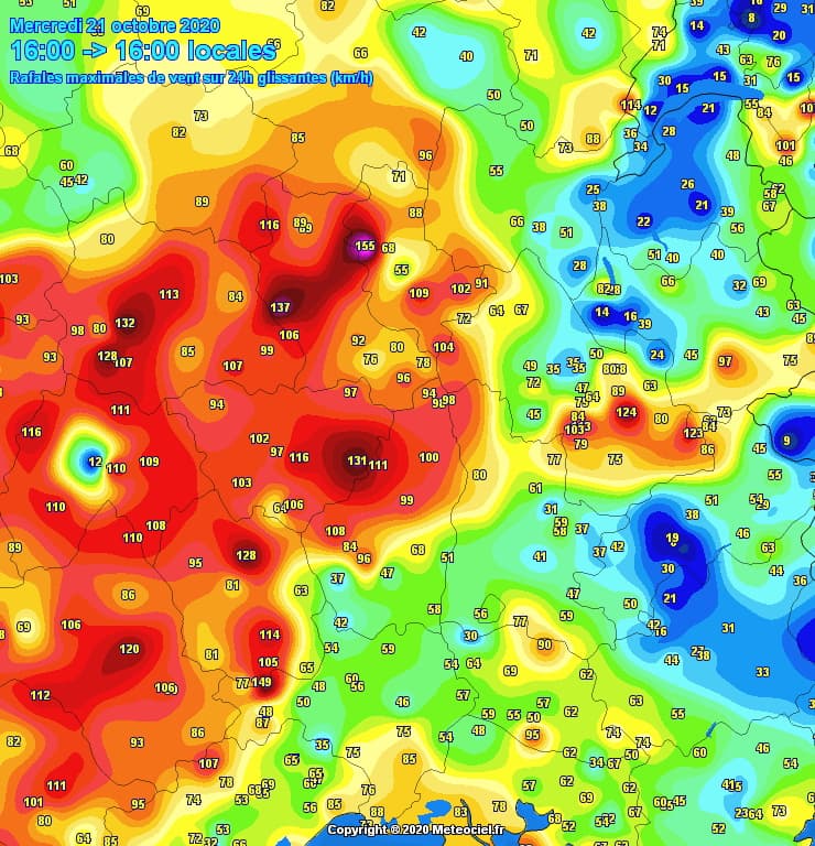 Déjà tempétueux durant la journée du mardi 21 octobre 2020, les vents ont atteint leur paroxysme durant la nuit du 21 au 22 octobre en se déchaînant notamment sur l'ouest de la chaîne. Des rafales exceptionnelles ont été enregistrées avec souvent plus de 150 km/h sur les crêtes.