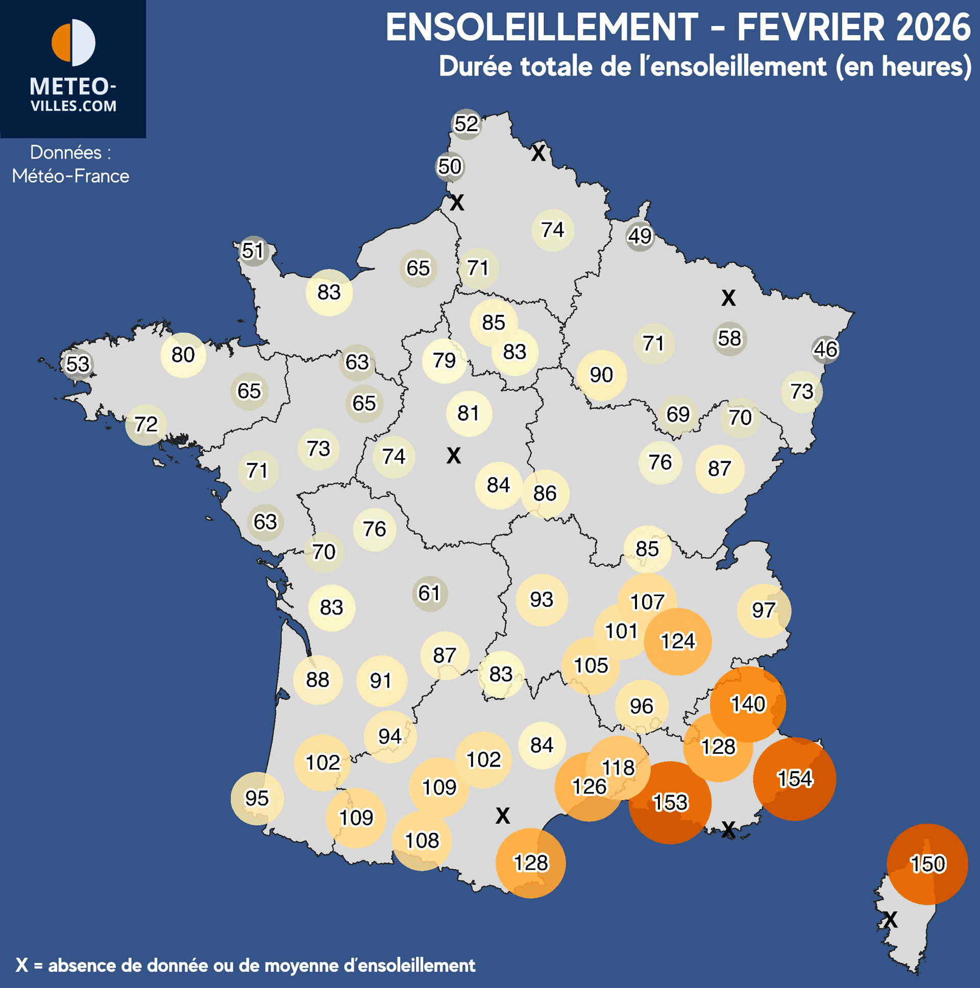 Seules les régions les plus au Sud sont parvenues à obtenir plus de 100 heures de soleil au cours du mois (Occitanie, Provence, Côte d'Azur, Rhône-Alpes, Corse). Les maximums ont été observés à Bastia (150h), Marseille (153h) et Nice (154h)