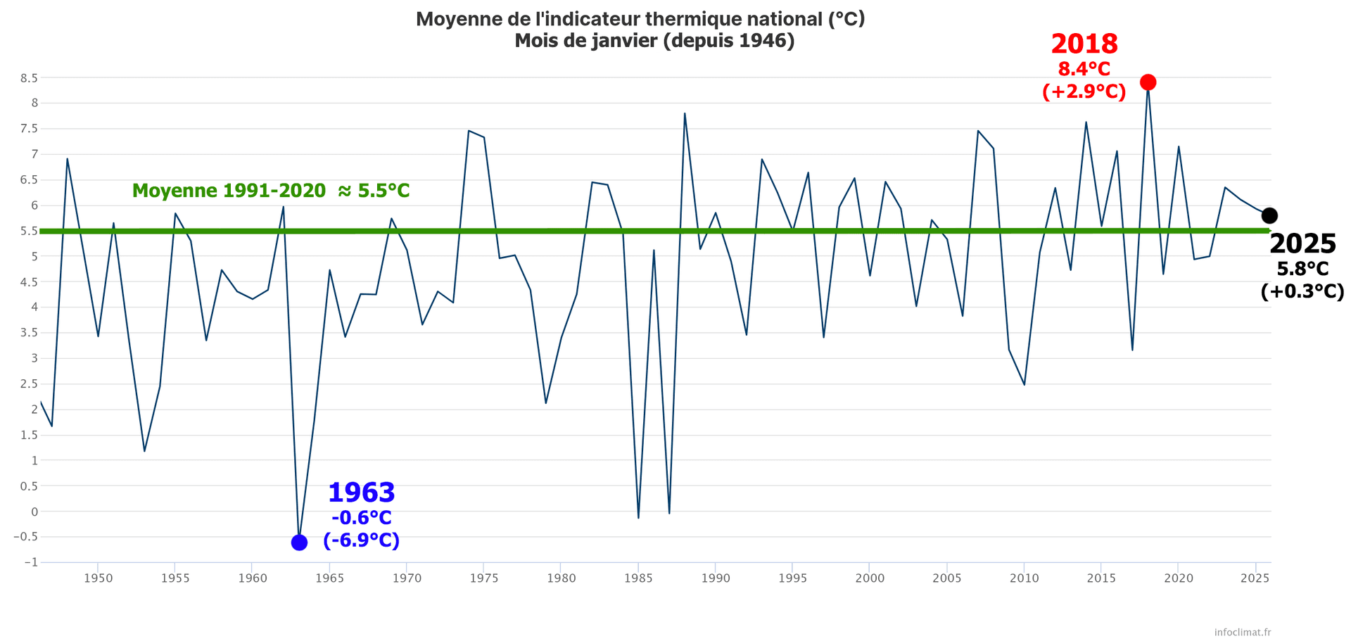Moyenne de l'indicateur thermique national en janvier depuis 1946 - Infoclimat