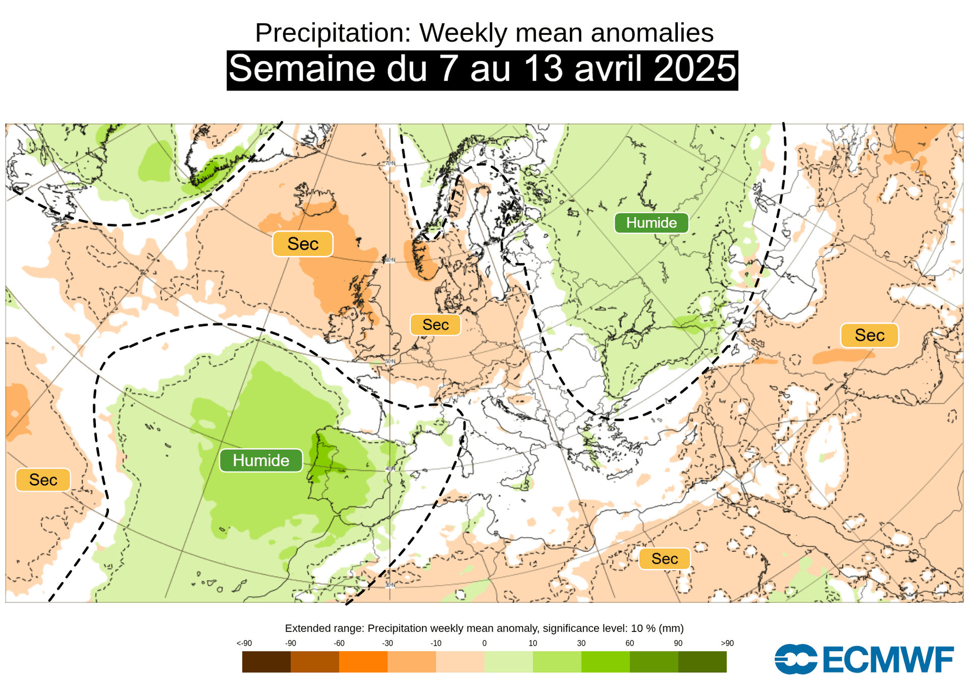 Anomalies de précipitations sur l'Europe pour la semaine du 7 au 13 avril 2025 – ECMWF