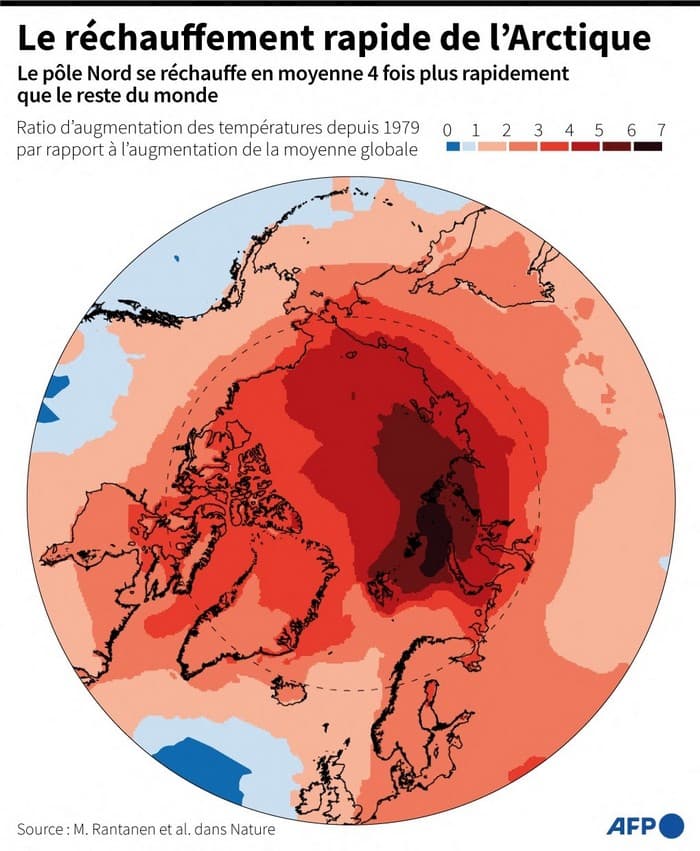Augmentation des températures en Arctique depuis 1979 par rapport à la moyenne globale – AFP