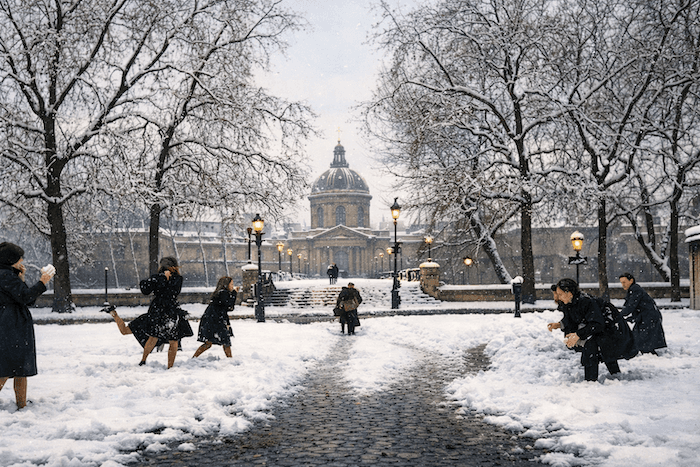 Une bataille de boules de neige devant le pont des arts à la fin du mois de janvier 1945 (et pourtant après 5 ans de guerre !) - meteo-paris.com