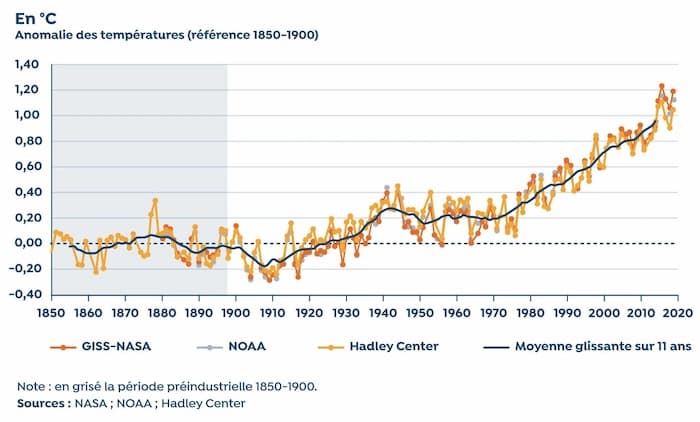 L'évolution moyenne de la température sur la planète indique une augmentation entre 1910 et 1945, alors qu'en France la température a tendance à baisser durant la guerre. Source : capitaine-carbone.fr/