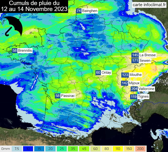 Les précipitations ont été abondantes depuis le dimanche 12 novembre 2023. Au cours des 72 dernières heures, les reliefs de l'est ont été les plus arrosés avec des cumuls dépassant les 100 mm. Dans le Jura, on a relevé 123 mm à Mouthe et 142 mm à Mijoux. Dans les Vosges, il est tombé 145 mm à La Bresse et 171 mm à Sewen ! Dans le nord des Alpes, il est tombé jusqu'à 204 mm en 72 heures à Vallorcine en Haute-Savoie ! Les régions de plaines n'ont pas été épargnées avec 60 mm à Onlay dans la Nièvre, 58 mm à Brennilis dans le Finistère et Passirac en Charente. Sur l'extrême nord, il est tombé jusqu'à 74 mm à Bainghen dans le Pas-de-Calais. Sur cette station, on atteint déjà 354 mm en novembre 2023 !