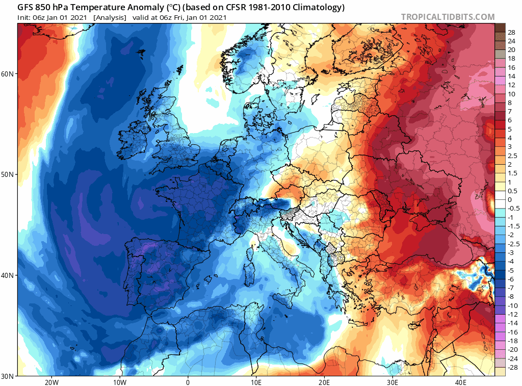 Comme l'illustre l'animation ci-dessus, l'Europe de l'Ouest est concernée par une masse d'air nettement plus froid que la normale depuis le début de l'année. On peut d'ailleurs constater l'inversion de la circulation zonale avec une zone d'air froid s'enfonçant de la Mer Baltique vers la péninsule ibérique et jusqu'au large des côtes nord-ouest de l'Afrique.