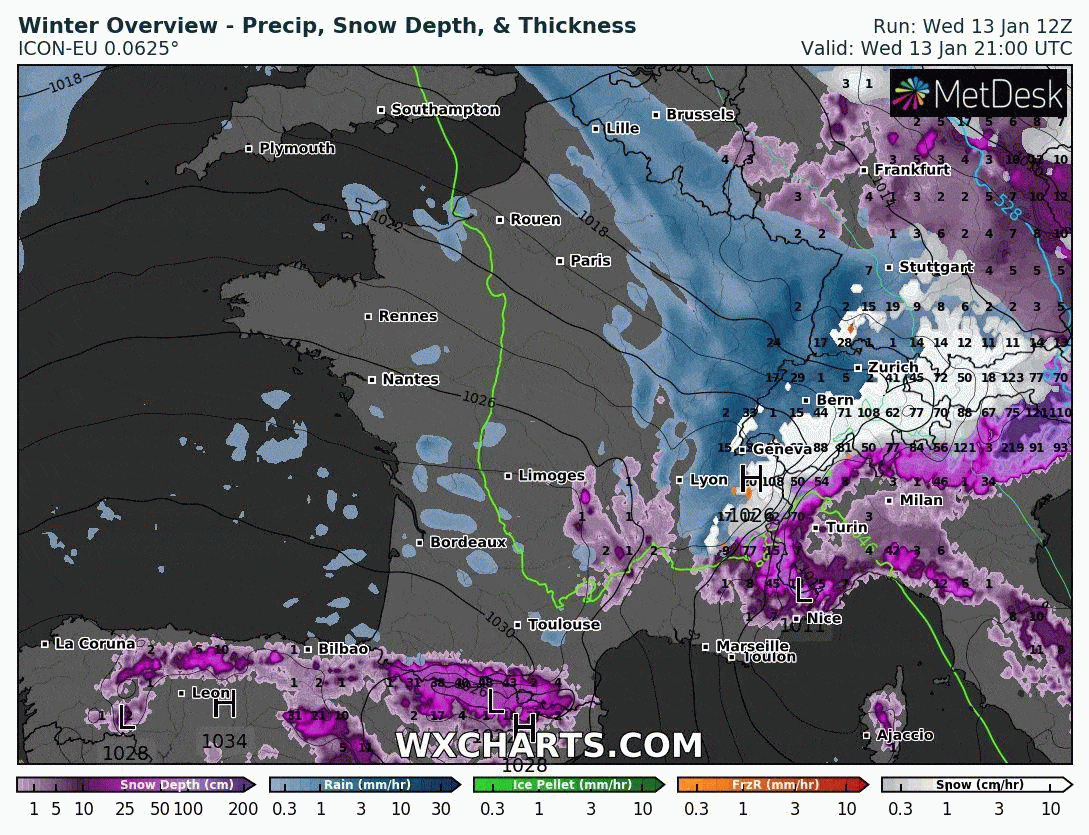 Animation des précipitations durant la journée du jeudi 14 janvier 2021 - via wxcharts.com
