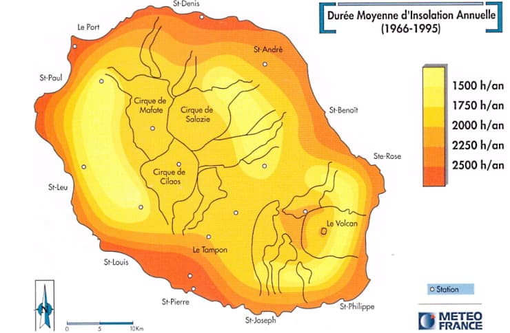 Comme pour les précipitations, le relief de la Réunion joue un rôle prépondérant sur le taux d'ensoleillement. En toute logique, les côtes sont les plus ensoleillées.