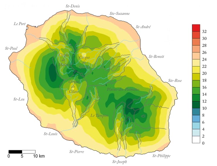 Moyenne annuelle du cumul de précipitations à la Réunion - via Météo France