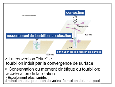 Ainsi, à l'image d'une patineuse qui resserre les bras le long de son corps, le tourbillon étiré va accélérer, entrainant une chute de la pression en son centre et la formation d'un vortex visible (baisse de la pression > baisse de la température > condensation). D'où l'apparence étroite, frêle et fragile des trombes terrestres/tornades misocycloniques/landspout.