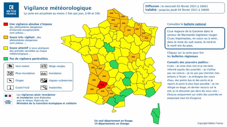 Au mercredi 3 février 2021 à 16 heures, on dénombre 19 départements français en alerte orange en raison d'un risque de crues et 1 département en ROUGE : le Lot-et-Garonne. Les alertes concernent essentiellement le sud-ouest et le nord-est du pays où la situation peine à s'améliorer et se dégrade même par endroits.