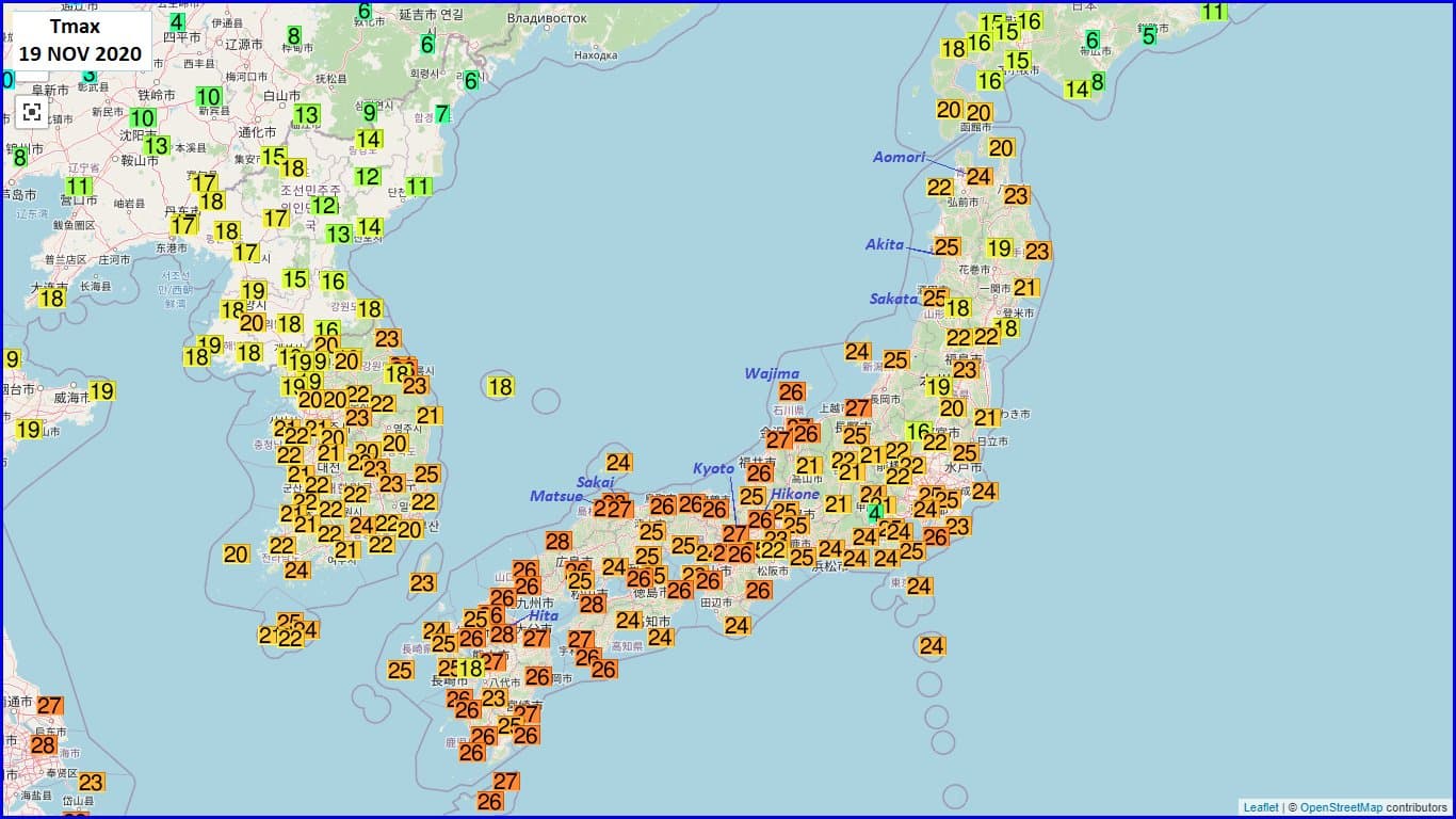 Cette chaleur persiste en ce 20 Novembre avec une nuit tropicale observée à Tokyo. La température n'est en effet pas descendue en-dessous de 21.0°C (provisoire) sur la capitale, possiblement un nouveau record mensuel national (battant les 18.7°C de Novembre 1914).