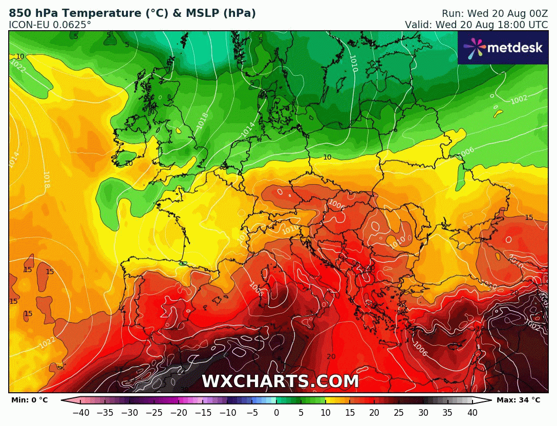 Masse d'air à 850 hPa (vers 1500m) du mercredi 20 au samedi 23 août 2025 - wxcharts.com