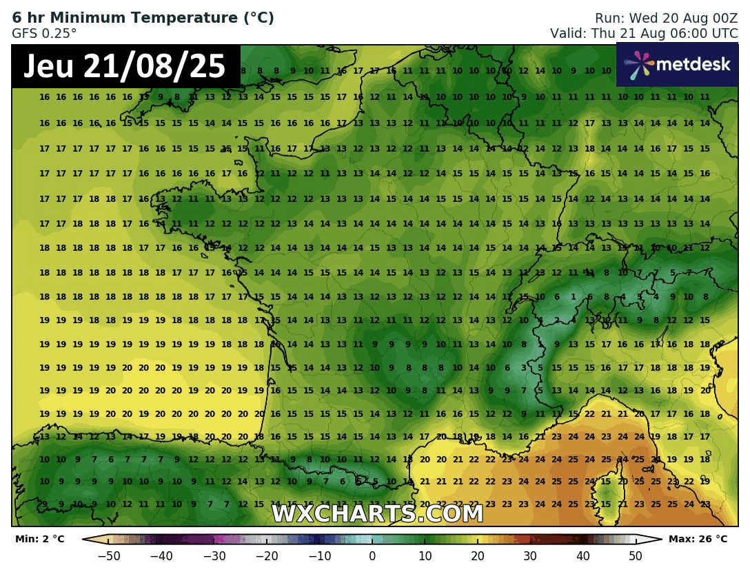 Outre les températures diurnes sensiblement moins élevées que lors des deux dernières semaines, nous allons aussi assister à une accentuation de la fraîcheur nocturne. Celle-ci surviendra surtout dès le matin du vendredi 22 août 2025, grâce à un ciel se dégageant durant les nuits. Ainsi, les matinées de vendredi et de samedi seront les plus fraîches avec des températures minimales fréquemment inférieures aux 10°C dans les régions du nord, du centre et de l'est. Des valeurs de 5°C sont envisageables vers les Ardennes ou le Massif Central. Elles repartiront en légère hausse à partir du dimanche 24 août 2025.