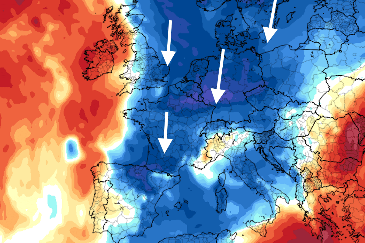 Une goutte froide circule actuellement au dessus de la France et amène une météo instable avec un net recul des températures diurnes ce mercredi 20 août 2025. À l'arrière de cette anomalie dépressionnaire, le flux basculera au secteur nord et advectera une masse d'air de plus en plus frais. Comme le montre l'animation ci-dessous, cet air frais viendra de Scandinavie et de Mer de Norvège. Il faut donc s'attendre à des températures passant sous les normales avec des nuits devenant de plus en plus fraîches.