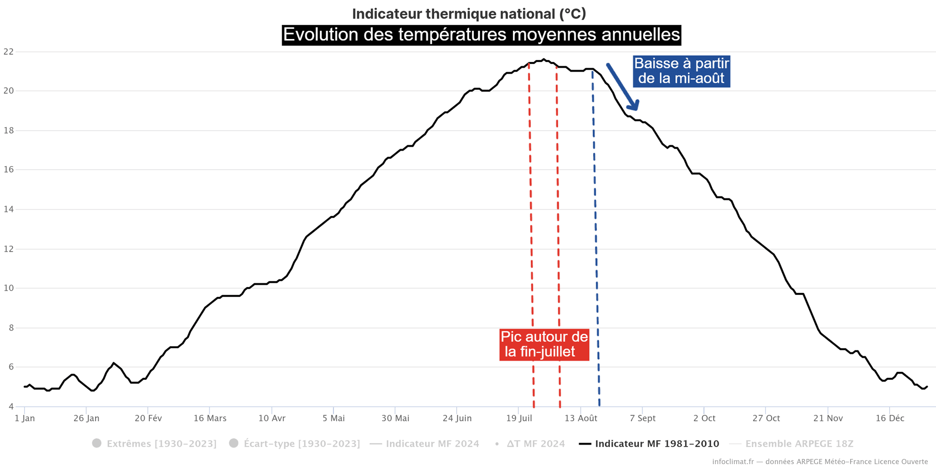 On dit souvent qu'après le 15 août, l'été tire sa révérence. Même si ce n'est pas tout à fait exact, il faut tout de même mentionner que la mi-août marque généralement un tournant. En effet, la climatologie montre que les températures moyennes en France atteignent leur pic autour de la fin-juillet. Elles n'évoluent quasiment pas en première quinzaine d'août puis entament une baisse assez nette à partir de la mi-août, qui s'accélère en dernière décade du mois. Ce n'est donc pas qu'une impression : l'été a pour habitude de décliner autour de ces dates.