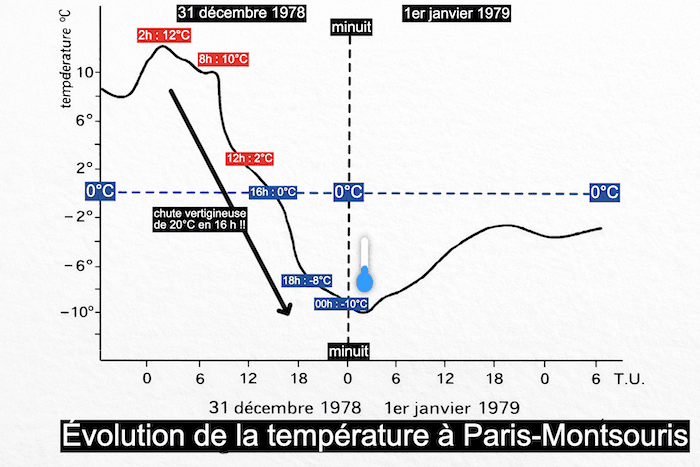PARIS, 31 décembre 1978, 18h... il fait -8°C !!  Le thermomètre affichera même -11°C vers 1h du matin ! Et cela après une matinée très douce (environ 10 à 12°C) ! Autant dire que la courbe de la température s'effondre de plus de 20°C en seulement l'espace de 24h !! Du jamais vu.