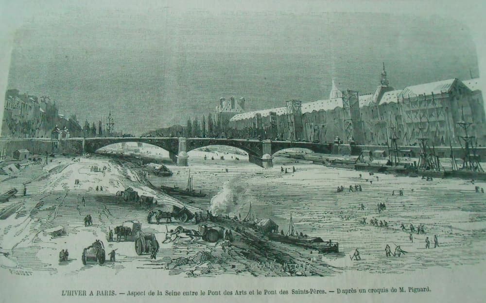 Hiver 1788-1789 : la Seine gèle pendant quasiment deux mois, avec des températures descendant jusqu’à –23 °C fin décembre.