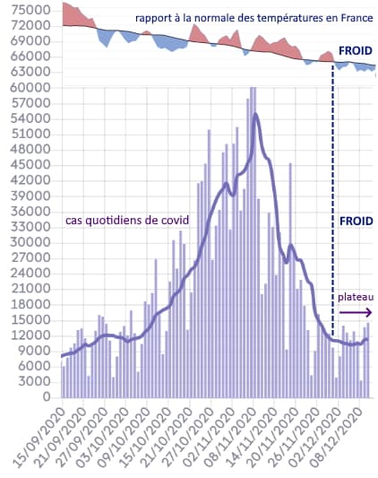Cas de covid-19 par jour et évolution de la température moyenne du 15 septembre au 10 décembre 2020 - montage Météo Villes via France Info et Infoclimat