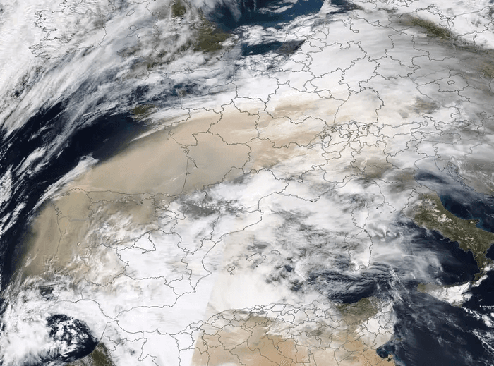 Image satellite montrant les grosses quantités de poussières de sable au dessus de la France le 15 mars 2022 – NASA