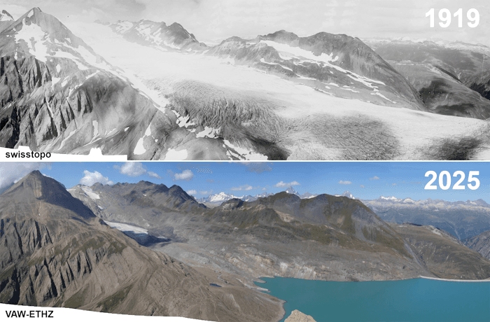 Recul majeur du glacier de Gries (Suisse) entre 1919 et 2025 - via Matthias Huss