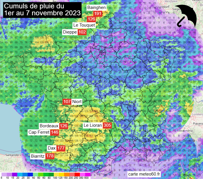 Cumuls de pluie en France du 1er au 7 novembre 2023 – carte meteo60.fr