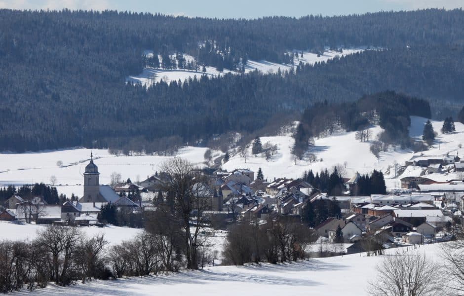 Le village de Mouthe sous la neige une journée d’hiver – via macommune.info