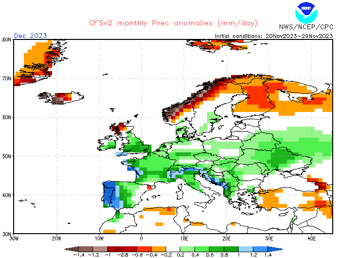 Modélisation de l'anomalie pluviométrique en Europe pour décembre 2023 - carte NOAA