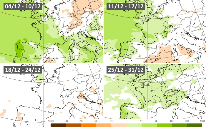 Anomalies pluviométriques hebdomadaires en décembre 2023 - modèle européen via ECMWF