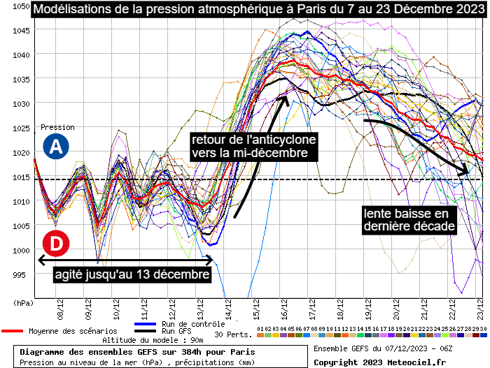 Modélisation des pressions à Paris du 7 au 23 décembre 2023 - via meteociel.fr