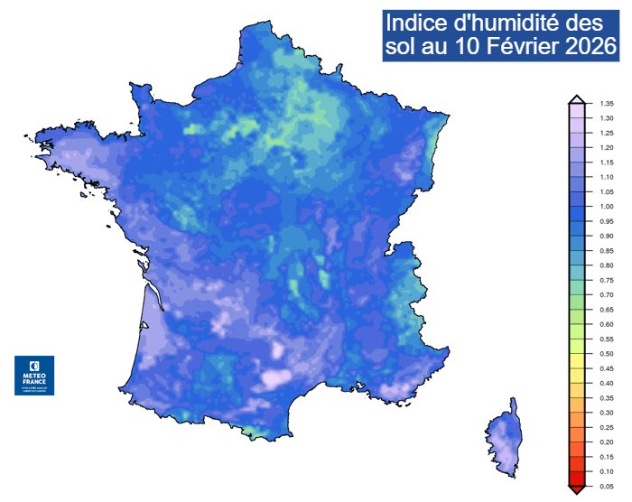 Indice d'humidité des sols en surface au 10 février 2026 - Météo France