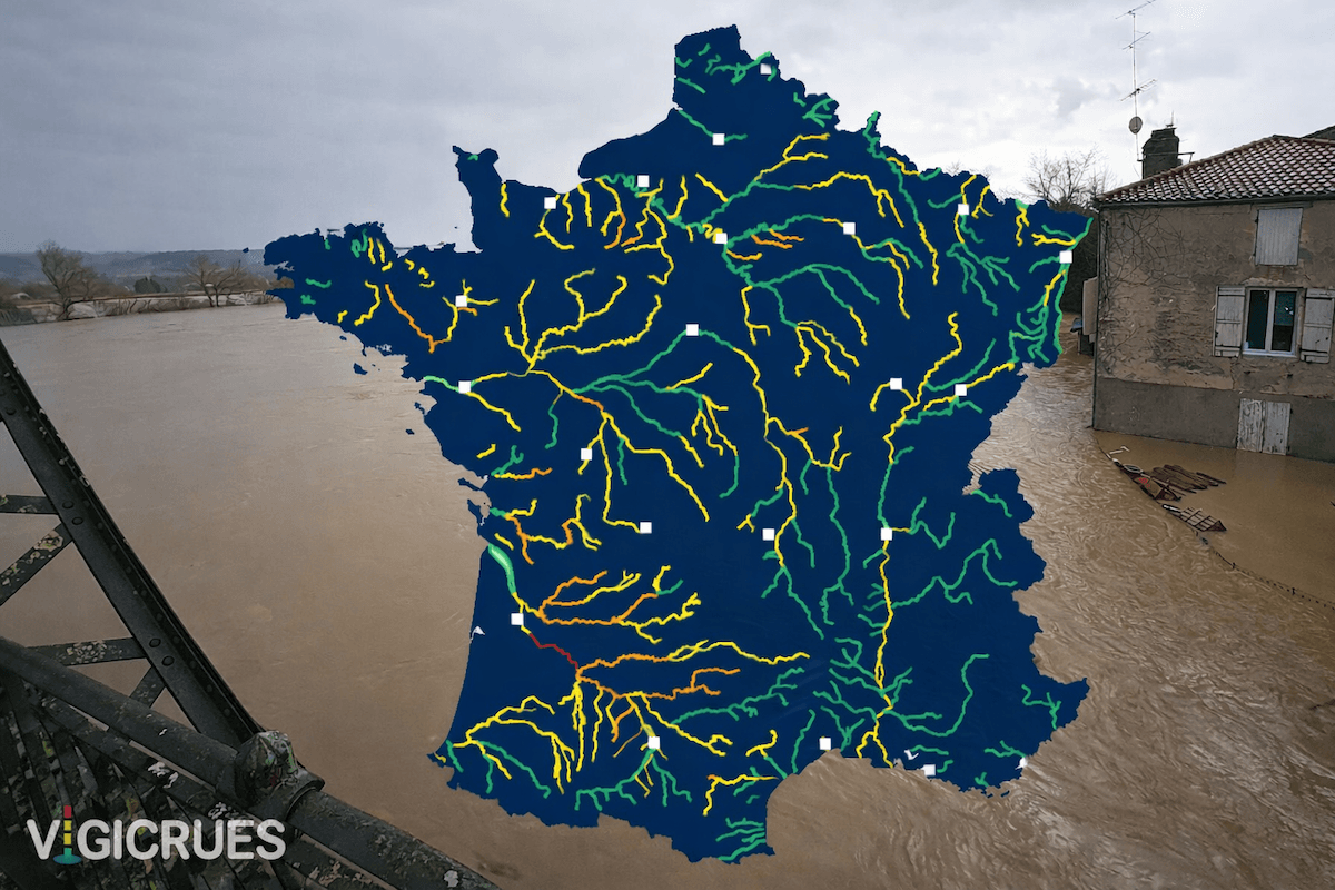 Crue majeure de la Garonne à Saint-Léger (47) le jeudi 12 février 2026 - photo Geoffrey Bigey & carte de vigilance des cours d'eau en France au vendredi 13 février 2026 au soir