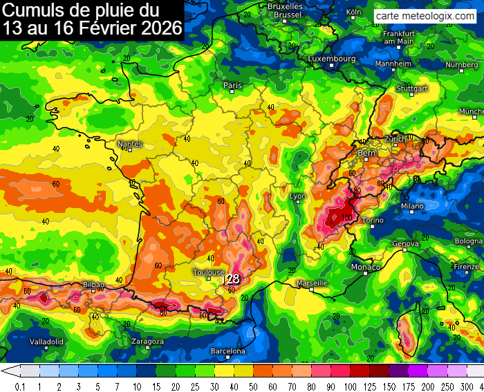 Cumuls de pluie prévus du vendredi 13 au lundi 16 février 2026 - meteologix.com