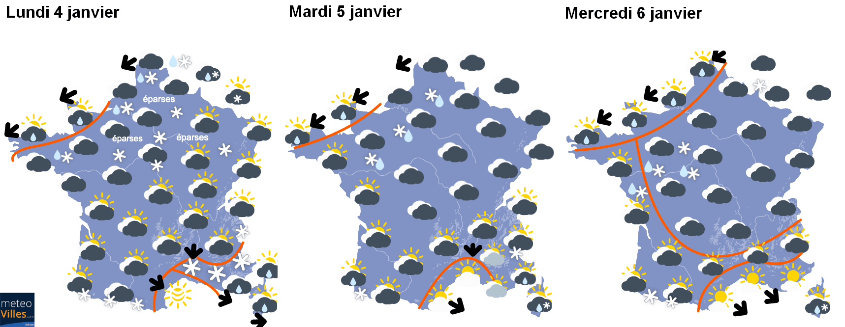 Conditions météorologiques envisagées pour lundi 4, mardi 5 et mercredi 6 janvier sur la France – Météo-Villes