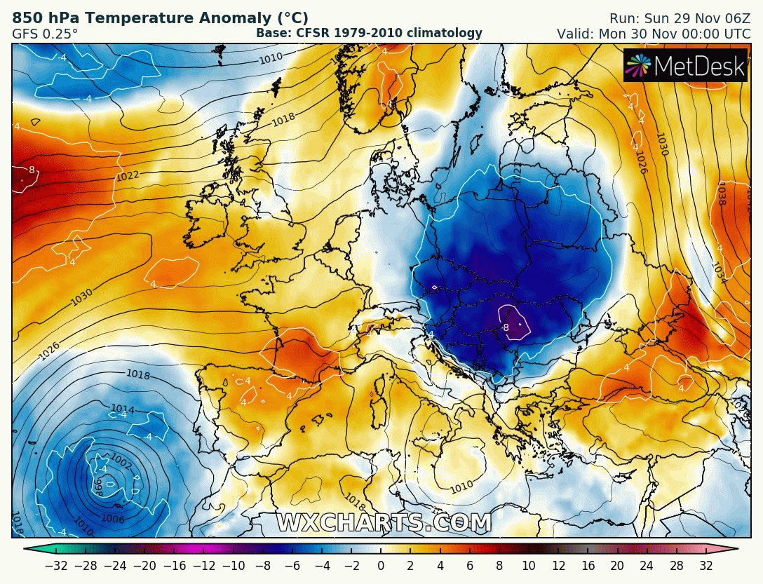 Anomalie de température de la masse d'air (1500m d'altitude) - du 30 novembre au 5 décembre - Modèle GFS via WxCharts