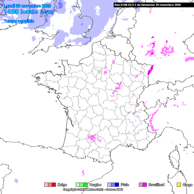 Type de précipitation modélisée ce mardi 1er décembre 2020 - Modèle ICON via Météociel