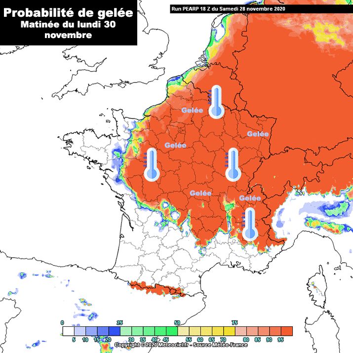 Probabilité de gelée - lundi 30 novembre et mardi 1er décembre - Modèle PE Arpège via Meteociel