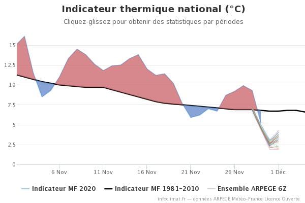 Indicateur thermique national de novembre 2020 et prévision jusqu'au 1er décembre - Infoclimat