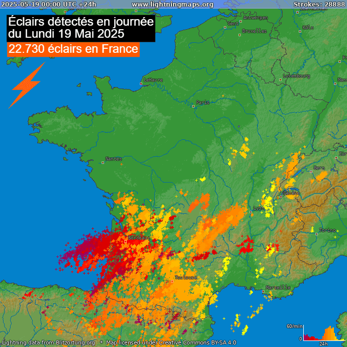 La dégradation orageuse de ce lundi 19 mai 2025 a généré 22.730 éclairs sur la France, un chiffre considérable d'autant que l'essentiel de l'activité orageuse a touché le quart sud-ouest de l'hexagone. Une première salve orageuse très matinale a balayé l'Aquitaine en matinée avant une seconde, plus virulente, sur l'ancienne région Midi-Pyrénées en après-midi et soirée. Cette dernière a généré de violentes chutes de grêle et des pluies diluviennes.