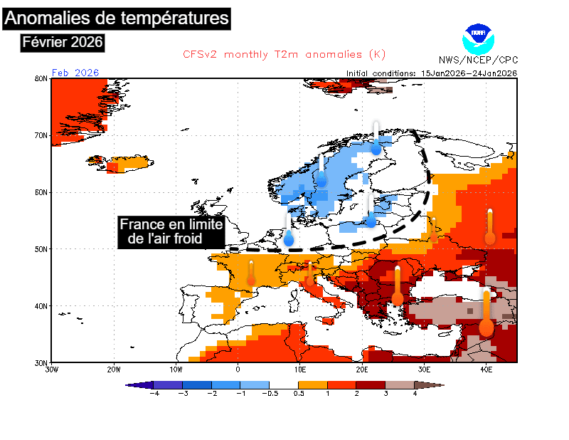 Ainsi, la France resterait en limite de cet air majoritairement froid durant le mois de février avec de l'air plus régulièrement doux sous une influence plus océanique mais il est tout à fait possible que de l'air bien plus froid s'étende au moins temporairement jusqu'à notre pays dans les prochaines semaine.