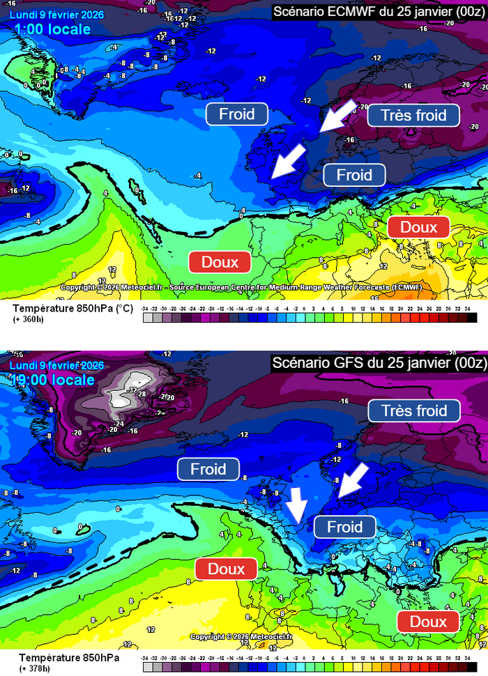 Différents scénarios montrant un possible retour du froid pour la fin de la première décade de février 2026 – via meteociel